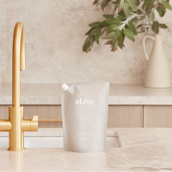 Remove cap and slowly pour formula from the refill pouch into your existing al.ive home kitchen bottle. Take care not to overfill, and leave space for the sprayer to be replaced back into the bottle. Has not been tested on porous or unsealed surfaces including stone, marble and terrazzo. Please patch test in a discreet location prior to use. Store your refill pouch at room temperature, ready for your next top up.