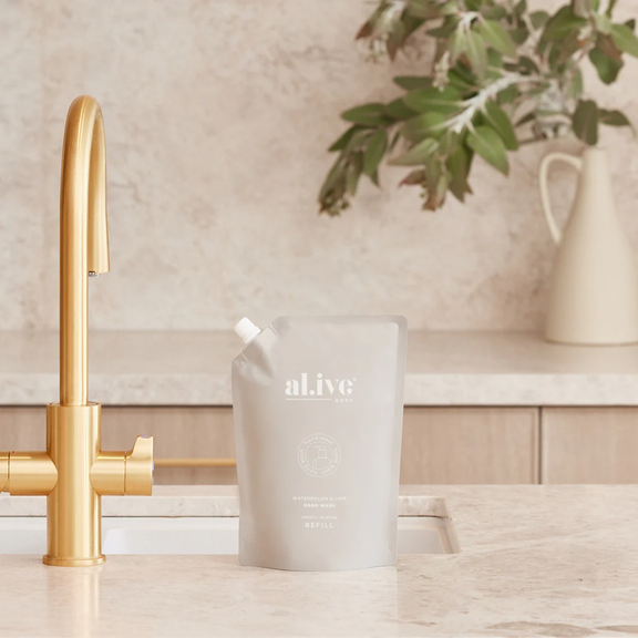Remove cap and slowly pour formula from the refill pouch into your existing al.ive home kitchen bottle. Take care not to overfill, and leave space for the sprayer to be replaced back into the bottle. Has not been tested on porous or unsealed surfaces including stone, marble and terrazzo. Please patch test in a discreet location prior to use. Store your refill pouch at room temperature, ready for your next top up.