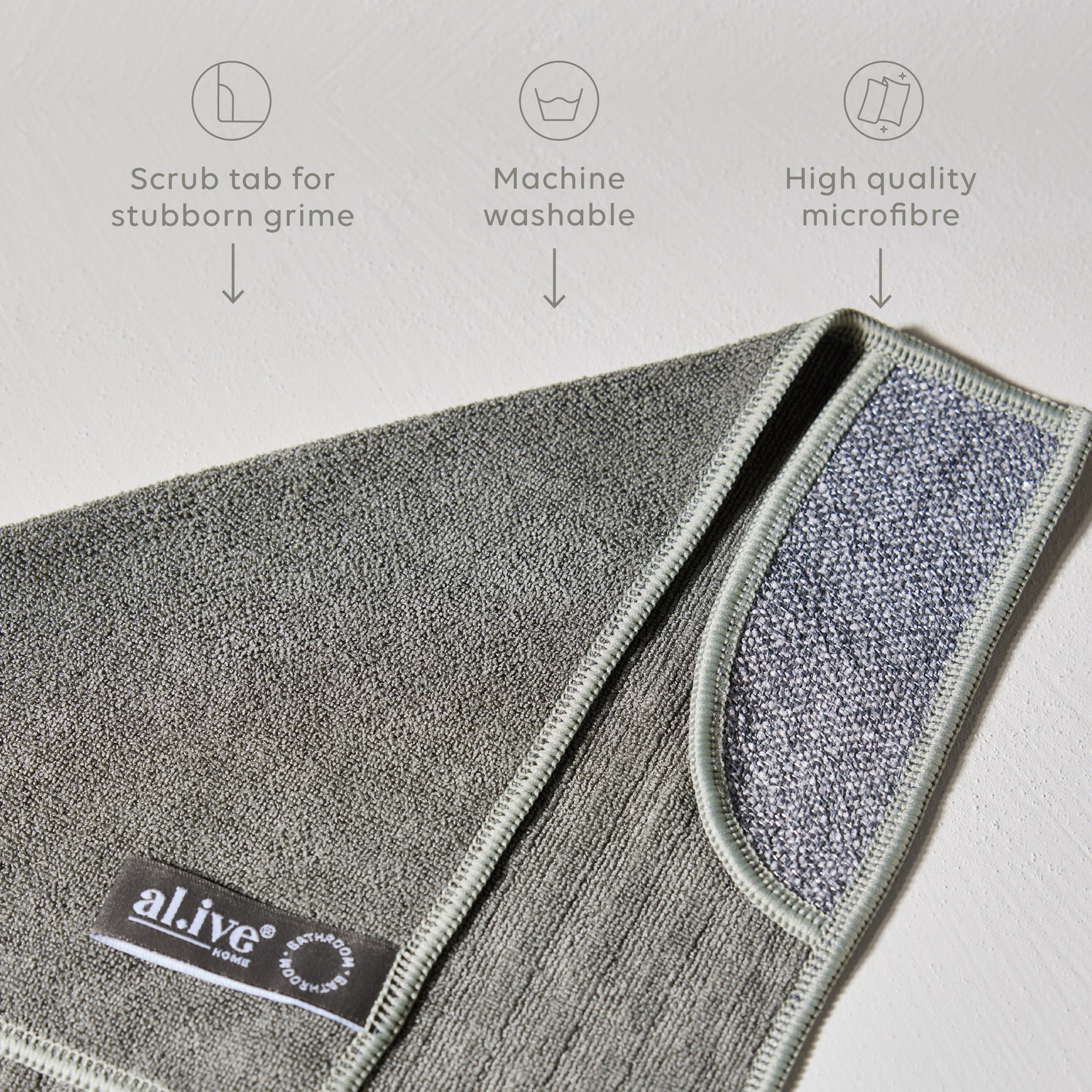 al.ive microfibre cloth is crafted with tightly woven fibres that efficiently capture and retain dirt and dust, ensuring a thorough cleaning. Its unique scrubbing tab provides added functionality, allowing you to effortlessly tackle stubborn spots and scum in your bathroom.
