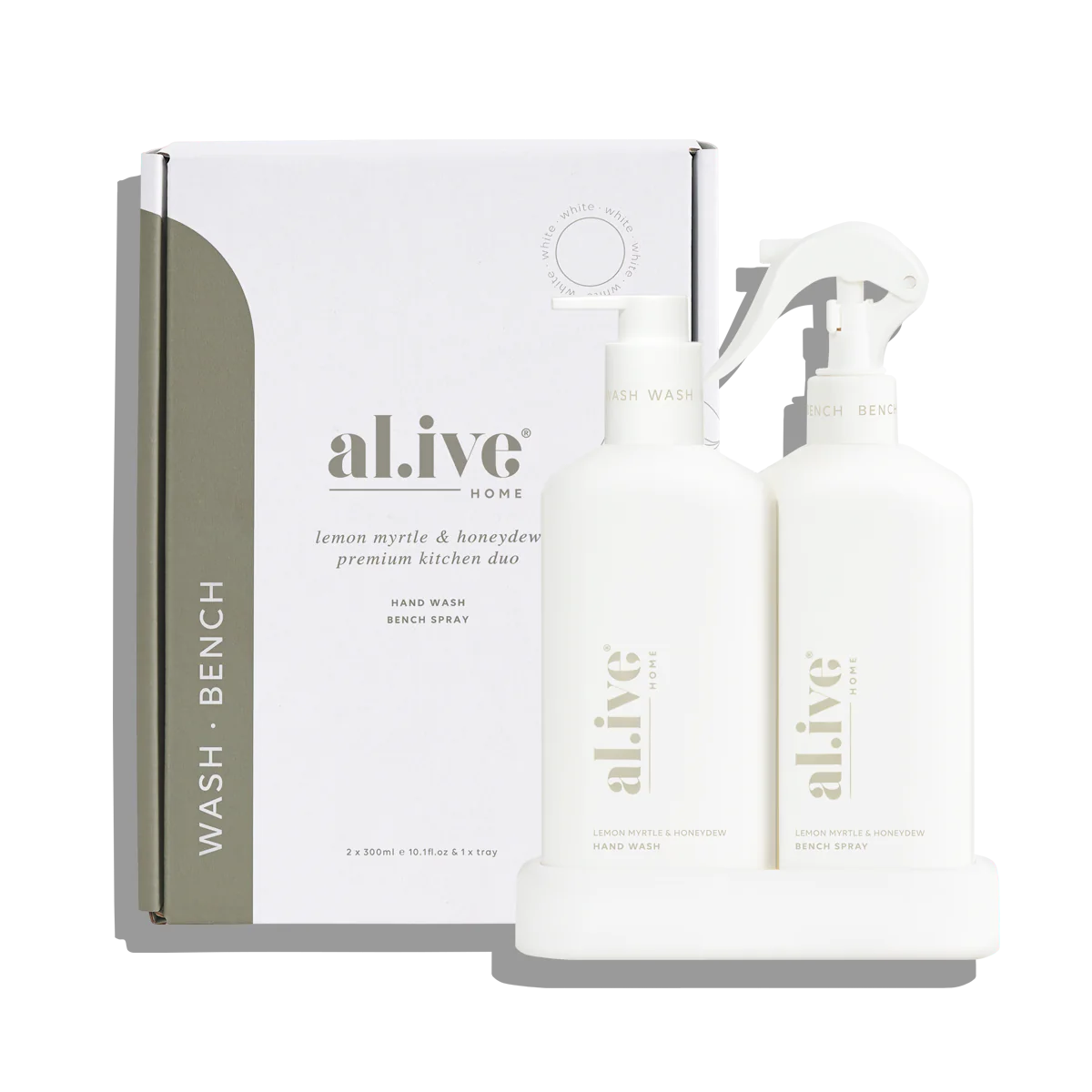 Enhance your kitchen routine with al.ive Lemon Myrtle & Honeydew Kitchen Duo in Crisp White. This set includes Bench Spray and Hand Wash, conveniently nestled within a beautifully designed custom tray to elevate your kitchen countertop.