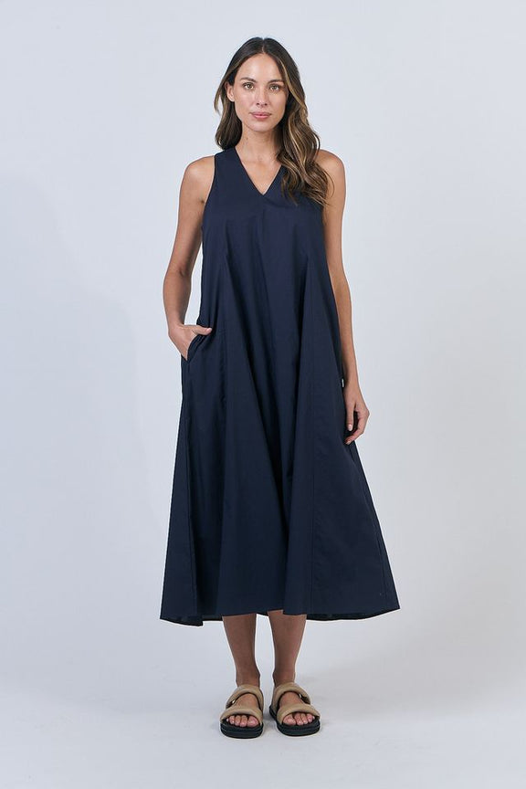 The perfect midi dress - while some dresses hug, this one dances-fluid & free. Featuring a flattering V-neckline and a comfortable sleeveless design. The A-line silhouette creates a graceful flare from the relaxed bodice to the mid-calf hemline, offering unrestricted movement with every step. Finished with practical side pockets and a clean cut back, this piece transitions smoothly from daytime to errands to evening gatherings - with minimal styling effort!