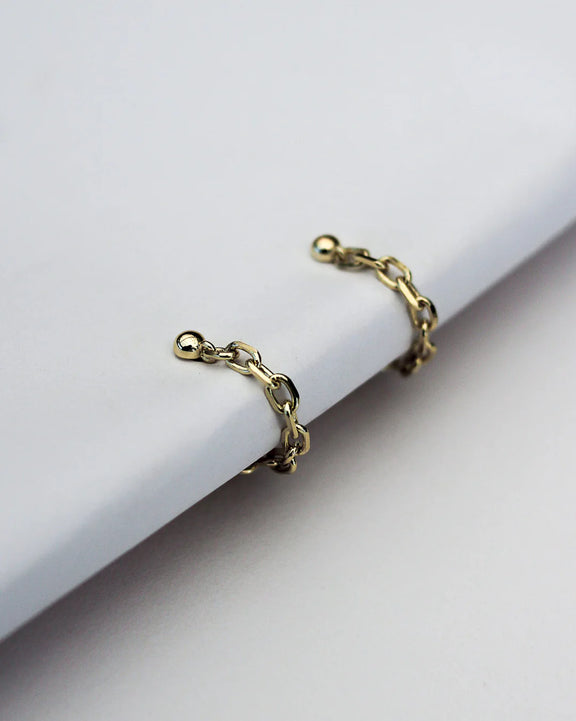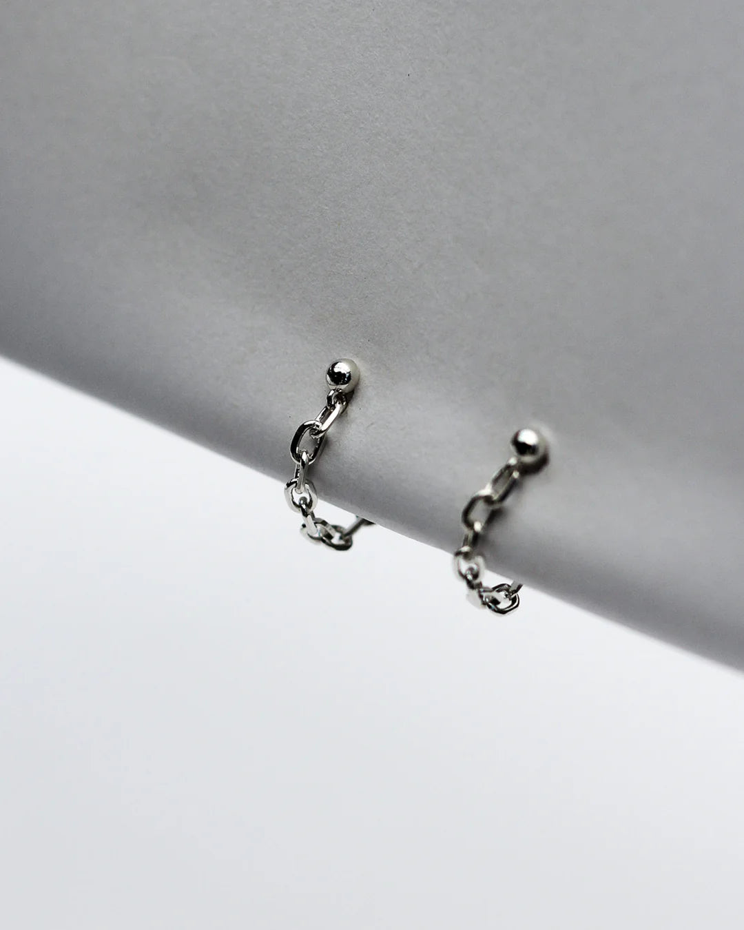 The Bruce Chain Stud Earrings feature a square link chain that is affixed below the stud to wrap around the ear lobe and secure to the butterfly clip backing.