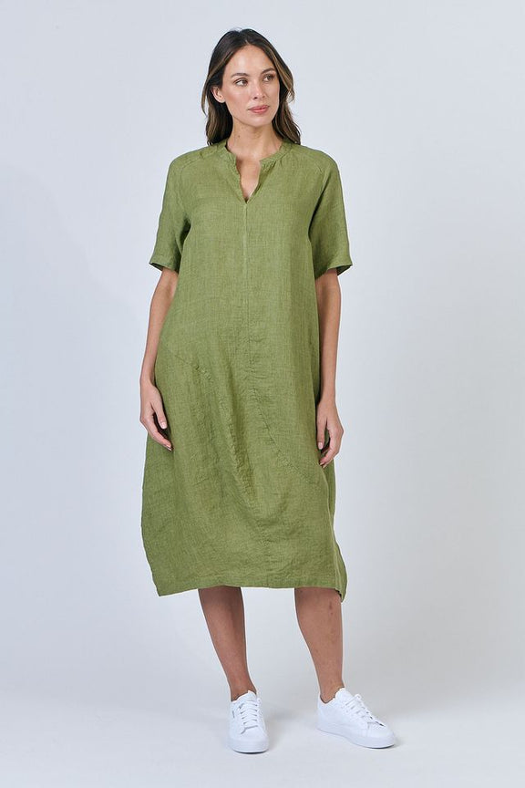 The kind of dress that makes "You look amazing" an everyday thing. Crafted from breathable 100% linen, features a clean collarless neckline and full length button through design that creates a flattering A-line silhouette. Thoughtfully designed with a short cuffed sleeves, a subtle empire waist seam and practical side slits for ease of movement, this dress transitions effortlessly from casual daywear to evening gatherings with a simple change of accessories.