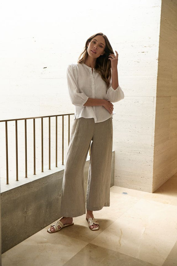 Full length wide-leg pant made from 100% breathable Linen, featuring two front pockets. A tailored look that pairs well with just about anything, from a cosy sweater to a loose fitting shirt or tee. Gathered detailing at the back waist band offers an ultra flattering design.