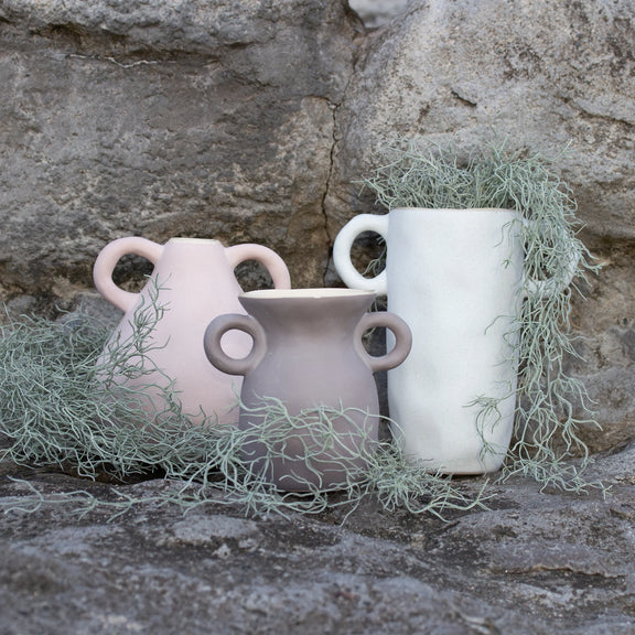 Handcrafted by artisans, the Potter Vases have a striking presence thanks to their organic structures and distinct handles. A mixture of soft tones with surfaces that feel powdery to the touch makes this a captivating set that will be sure to garner attention.