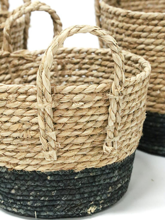 Bring effortless charm and functionality into your home with the Set of 3 Santai Woven Baskets. Crafted from natural seagrass with a two-tone black-dipped base, these handwoven baskets blend rustic textures with a contemporary touch. Their sturdy handles make them ideal for easy transport, while their spacious design provides versatile storage for anything from blankets and toys to potted plants. Whether styled together or used separately, these baskets add warmth and practicality to any space.
