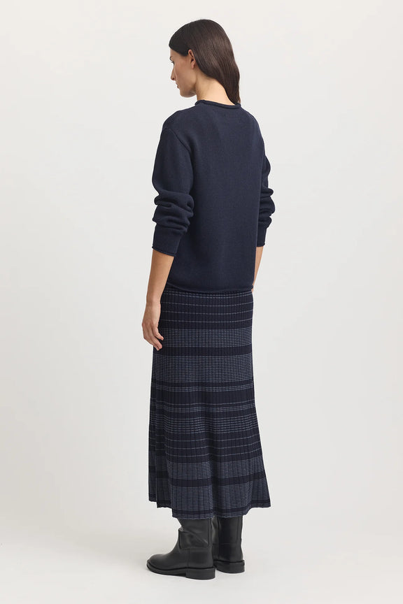 The Merino Lambswool measures 19.5 microns and is classified as superfine, meaning the wool fibre is resilient with a lofty and soft feel. This garment is a single jersey fabric knitted on a 5-gauge flatbed knitting machine.