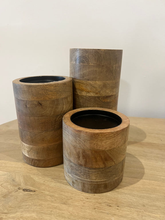 Elevate your ambiance with this exquisite set of three handcrafted wooden candle holders, adding a touch of sophistication and luxury to any space. Candles not included.